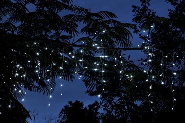 Comprei algumas luzes, um brilho discreto. Escolhi a árvore e fiquei acompanhando o esmero com que o Guinho, rapaz que me ajuda no jardim, distribuindo a pequena cascata branca pelos galhos do flamboyant que eu salvei de uma obra, replantei e este ano floriu pela primeira vez. Agora meu flamboyant tem flores vermelhas e luzes brancas. Mal começou a escurecer acendi. Ficou muito lindo. Pedi a Claudia para fotografar. Vou comprar mais lâmpadas e iluminar outras árvores. Ao menos no meu jardim é natal.