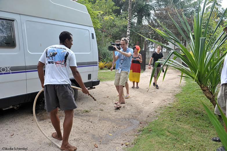 Marita e Werner ficaram encantados com as árvores nativas do jardim da minha casa e ao ver a água jorrando de um aspersor na grama ele perguntou se poderia pegar um pouco de água para abastecer “sua casa”. E foi assim que “a casa deles” veio visitar a minha. Marita ria muito e repetia “Super, we are neighbors” e neste clima de amizade enquanto Werner entrava com a motor home pelo portão, veio correndo atrás uma equipe de uma TV alemã. O repórter bonitão que deve ser bem famoso explicou que é da n-tv (escreve-se mesmo em minusculo), uma emissora como a CNN e estava feliz com aquele momento exclusivo mostrando brasileiros e alemães se relacionando tão bem. E enquanto Guinho enchia o deposito de água, a entrevista foi feita e até Xico, o Golden retriever aqui de casa virou estrela… Aguardo o email do jornalista com o link da matéria, estou fazendo meu clipping na imprensa alemã… Abaixo fotos deste encontro…
