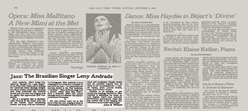 Em outubro de 1983 passei a madrugada andando pelas ruas de Manhattan esperando o jornal The New York Times ir para as bancas. Não andava sozinha, estava com a Lali Jurowski e o Zé Luiz Oliveira esperando para ler a crítica do show de Leny Andrade no Blue Note… Foi o Zé quem fez o contrato da Leny para seu primeiro show na Big Apple, a Lali minha amiga era produtora e intérprete da cantora e músicos, e eu tinha intermediado com a agencia de turismo aonde trabalhava o patrocínio da hospedagem e passagem aérea para a “brazilian jazz singer” conquistar a América. Lembrei desses momentos com a notícia de que hoje Leny está fazendo 79 anos…
