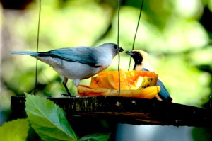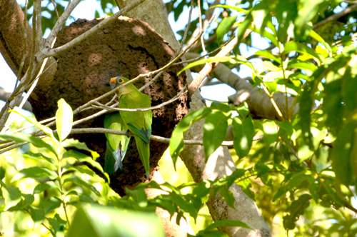 Gosto dos domingos quando faço o café da manhã num ritual silencioso e solitário… Trago esta lembrança de todas as casas por onde vivi, o prazer de arrumar a mesa, colocar as delicias disponíveis na cozinha, preparar panquecas, passar o café e depois sentar para digerir calmamente o banquete e as letras dos jornais e revistas… Aqui em Santo André há uma alteração nos componentes da mesa. Sem jornais ou revistas do dia, “releio” minhas memórias, viajo nos pensamentos, enquanto os passarinhos chegam para comer o que sobrou do mamão cuja casca, cuidadosamente coloco em um pedaço de madeira na árvore. E foi olhando os passarinhos nesta manhã que vi dois periquitos trabalhando numa enorme casa de cupim. Eu bem que pensara em retirar a casa de cupim há algumas semanas quando fiz a poda no quintal, mas esqueci, e o Guinho, que me ensina os “segredos’ da vida rural, comentara que às vezes periquitos fazem ninho em velhas casas de cupim. Fiquei torcendo para os periquitos saírem ganhando nesta disputa e acho que deu certo. Enquanto um periquito entra na casa e faz a limpeza, o outro fica do lado de fora tomando conta.