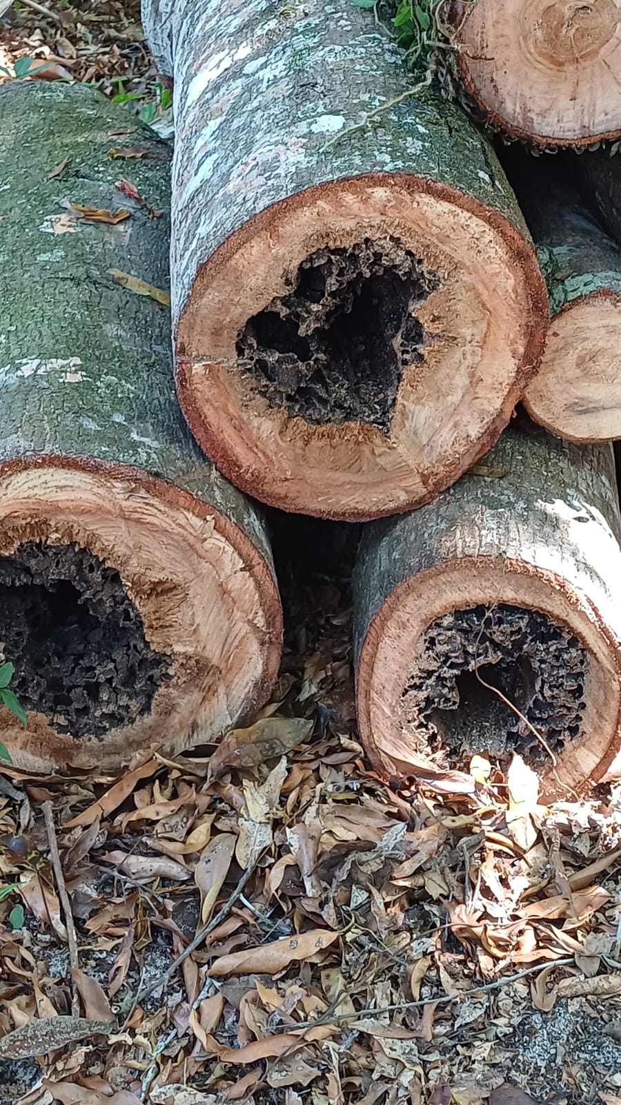 Consultei Jean e Carlos, da Fazenda Arimugue, que têm grande experiência em meliponário (colmeias de abelhas sem ferrão) e apiário (colmeias de abelhas Apis). Eles recomendaram deixar os troncos próximos de onde estava a árvore. Assim, quem sabe, as abelhas continuam por lá até dezembro, quando eles voltam de viagem e poderão transferi-las para uma casinha.