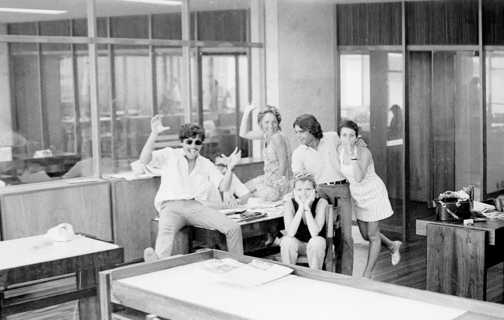Ainda não consegui reler “Ninguém é loira…”, preciso de fôlego, calma no coração e uma caixa de lenços de papel ao lado, pois vou chorar pelo tempo e amizade com que foi criada e como estamos agora. Mas antes de ter este fôlego, ontem, quando fui desligar o celular para dormir, vi uma foto que chegou no Messenger e me tirou o sono. Era eu aos 20 anos na Bloch, Rua do Russel, em 1969. As fotos foram feitas por André Costa e Silva, um jovem que estagiava na casa e fazia algumas matérias para a Revista Amiga. Eu comecei em jornalismo como tudo em minha vida, muito por acaso. A convite do Moyses Fuks fui para a Bloch Editores que ia lançar uma revista sobre TV chamada Amiga. Estas fotos são da redação e quem trabalhou lá ou conheceu o prédio da rua do Russel vai se lembrar do cenário. Era um luxo de arquitetura e construção. Mármore, vidro, jacarandá, couro e tapetes por toda a parte, intercalados com obras de arte sem contar o visual para o parque do Flamengo. Tinha um restaurante com uma piscina, mesas redondas para 8 pessoas com toalha e guardanapos de linho branco, talheres de prata e copos bico de jaca.